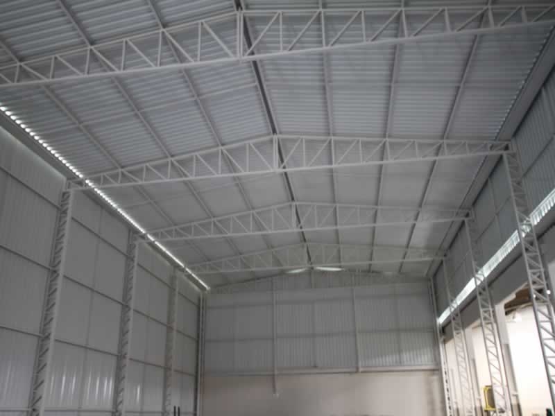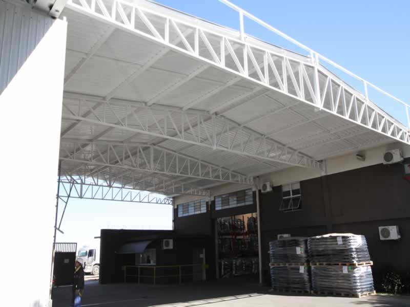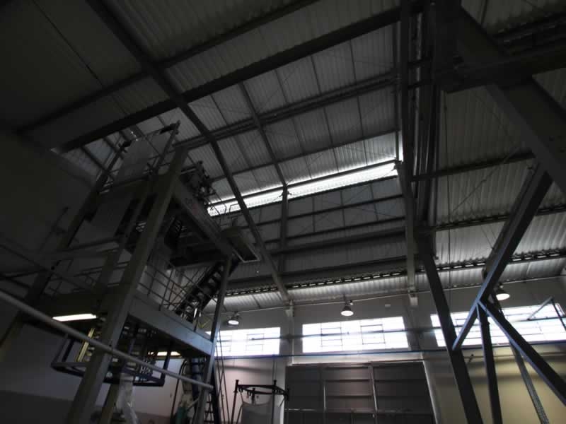 Ampliação de obra industrial, com alteamento de cobertura para instalação de equipamento de grande porte, novos pisos de concreto e ampliação da área coberta dos galpões.