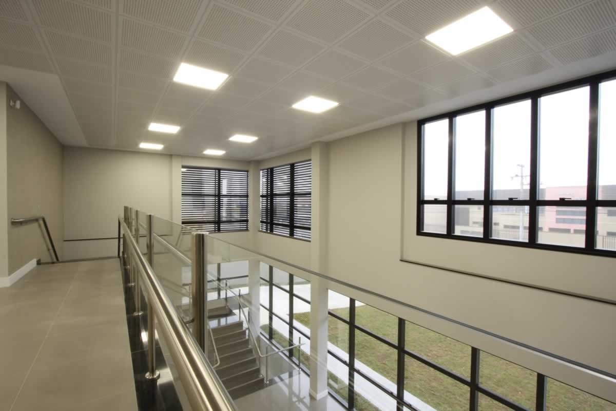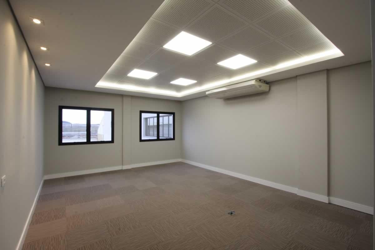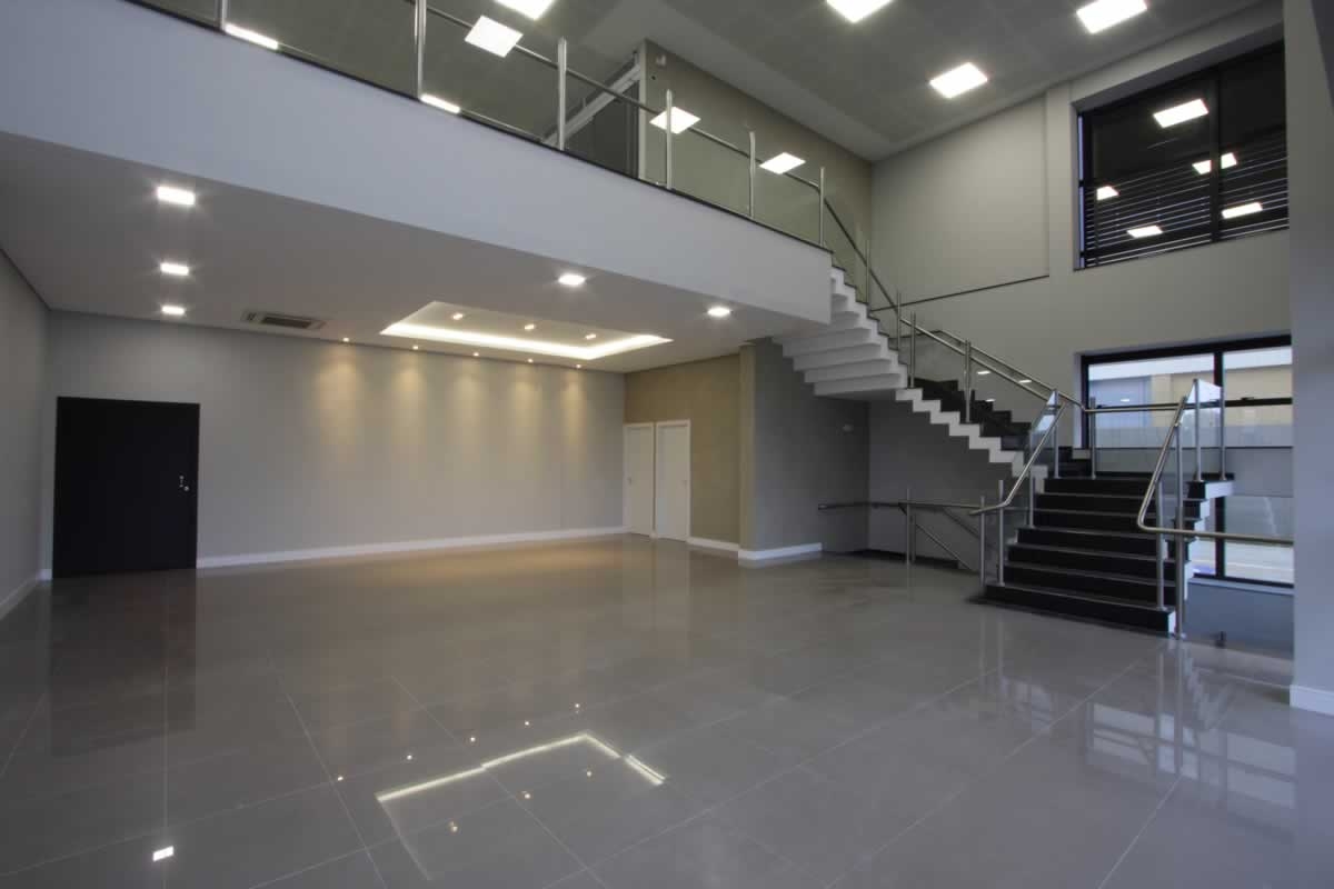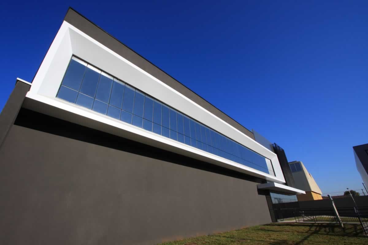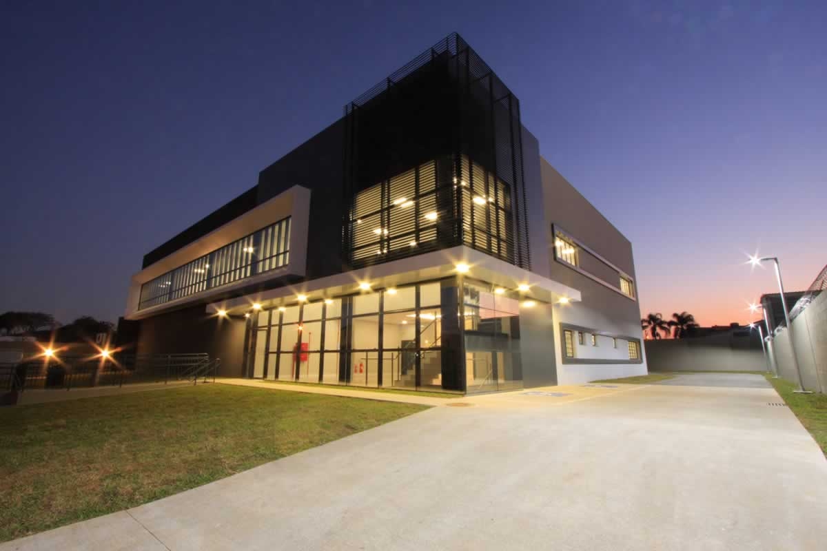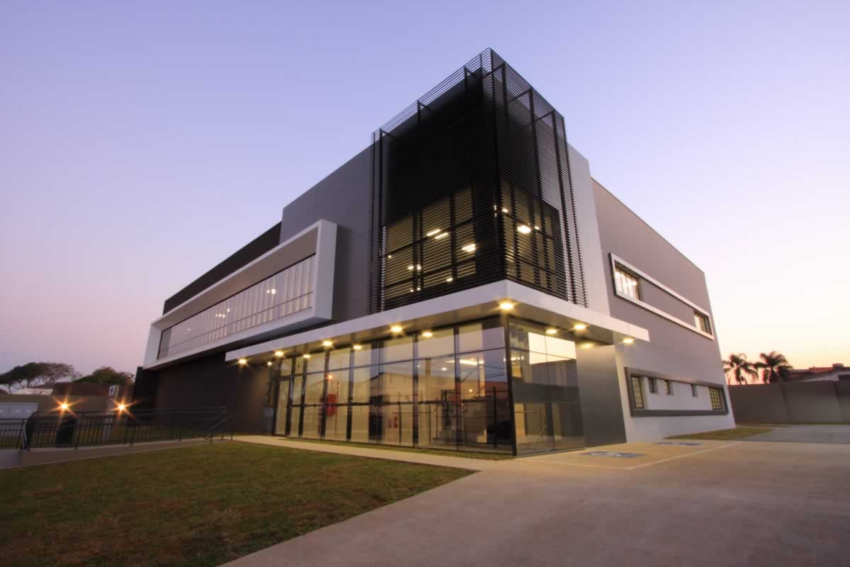 Escritório comercial executado em concreto armado, com acabamento moderno e adaptado a empresa de tecnologia.