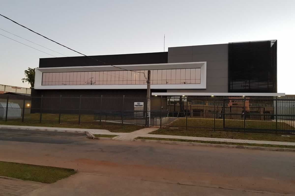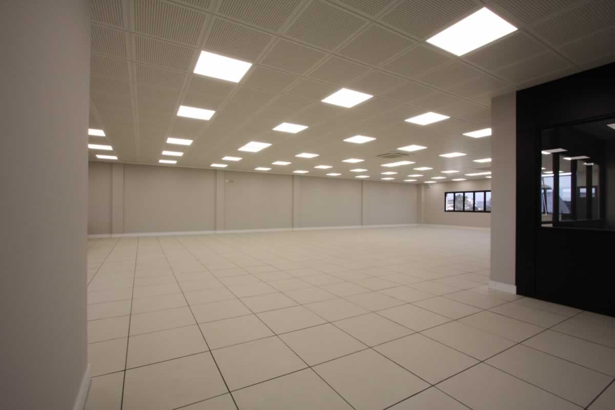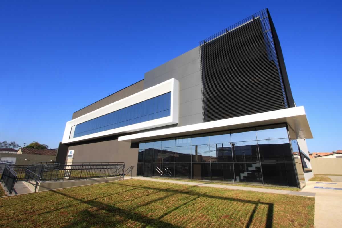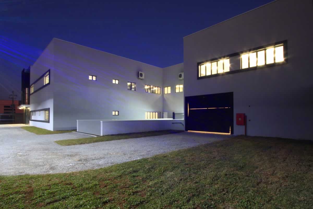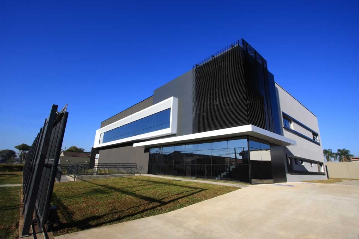 Escritório comercial executado em concreto armado, com acabamento moderno e adaptado a empresa de tecnologia.