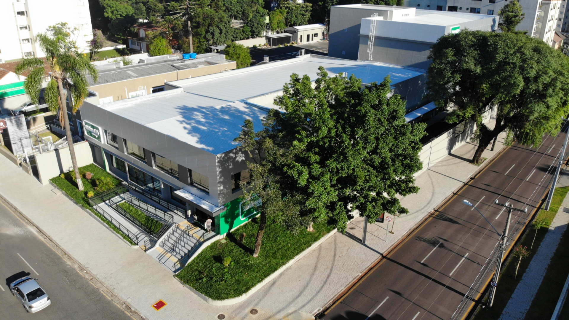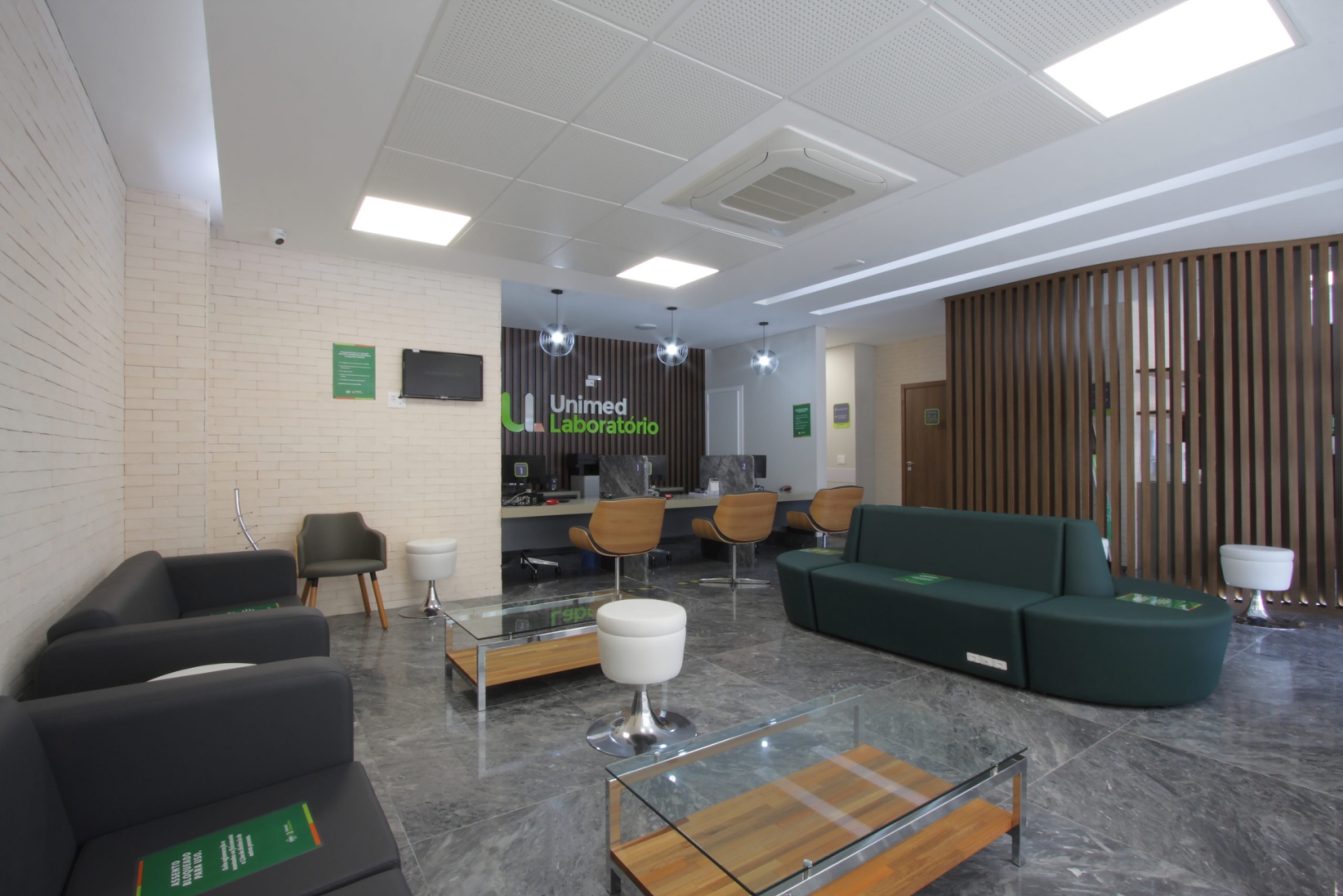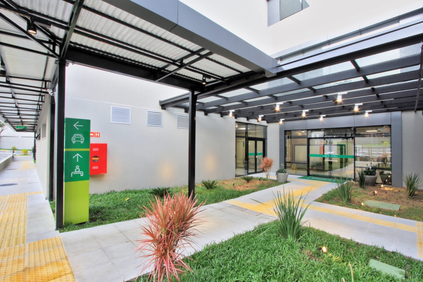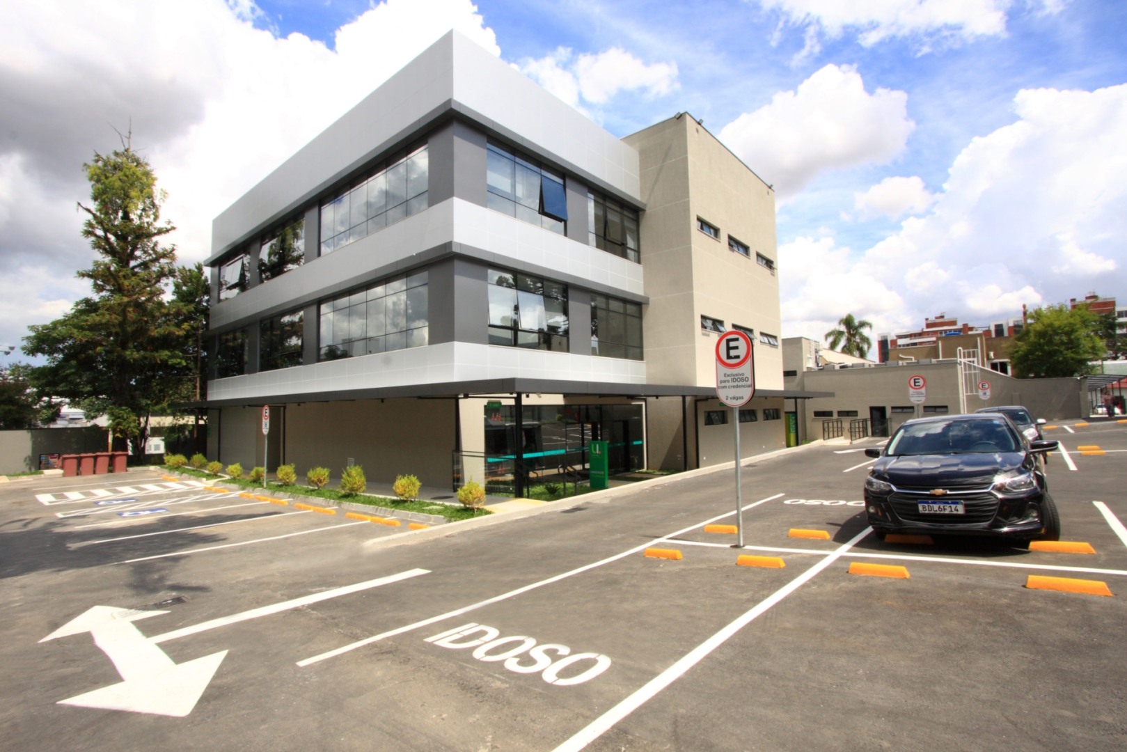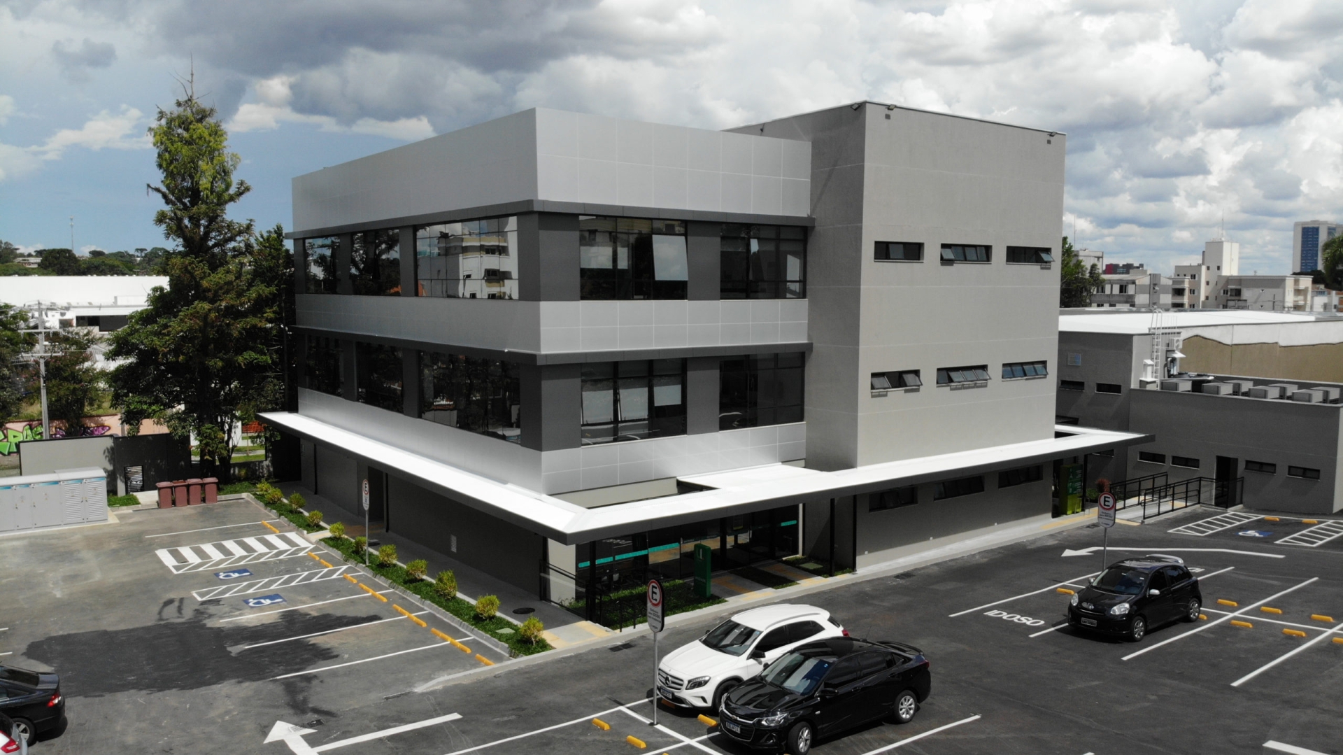 Edificação de uso administrativo com laboratório clínico. Obra que envolveu a reforma de um antigo prédio existente e uma ampliação de um novo prédio em estrutura pré-fabricada.